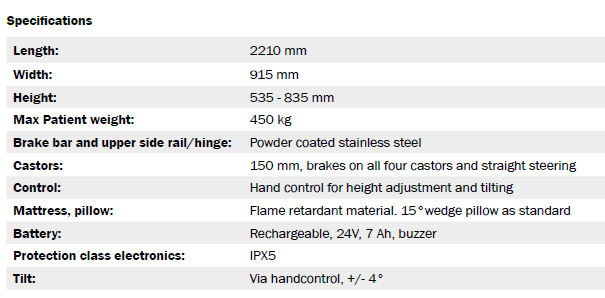 The Atlas shower trolley is developed to provide space and capacity for your most demanding patients. It can be used for showering, as a changing trolley, or as a treatment trolley. The possibilities are many. Maximum load capacity for this trolley is 450 kg / 1000 lbs.