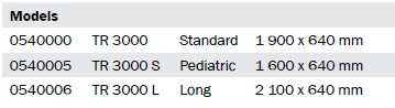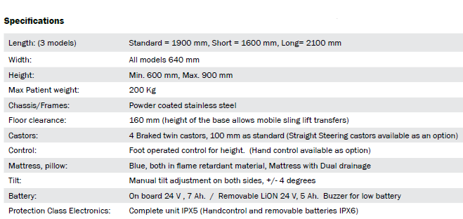 All TR3000 models come delivered ready for use with a MagCode charger, mattress, head pillow, 4 braked castors and 1 m flexible drainage hose.