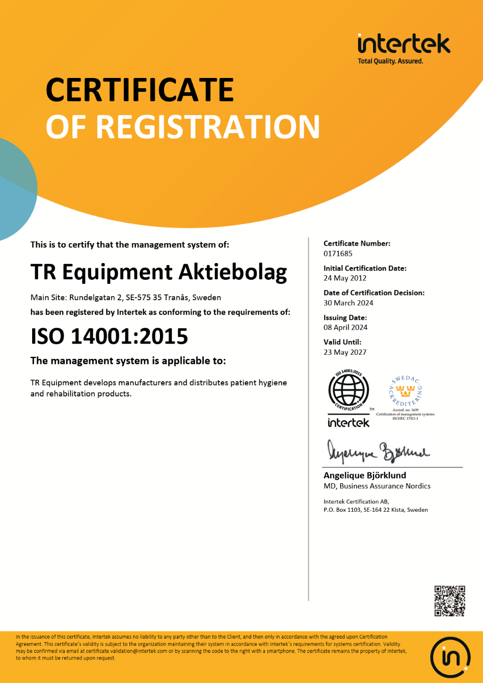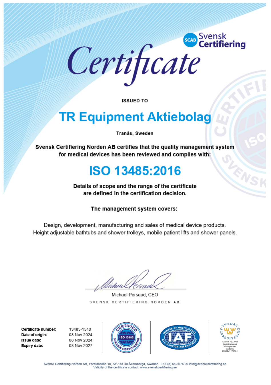 Quality Certificates Quality Certificates ISO 14001 2015 Certificate TR Equipment (PDF) ISO 9001 2015 Certificate TR Equipment AB (PDF) ISO 13485 Certificate TR Equipment AB